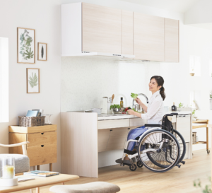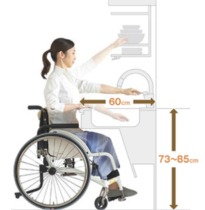 シンクやコンロの下に空間があって車いすでも正面からアプローチすることができるキッチンなんです。